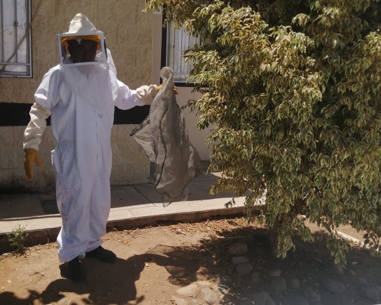 En una labor titánica, el apicultor Humberto Jiménez, diariamente atiende un promedio de tres a cinco reportes; con su traje blanco, botas, casco, guantes, trampas de colmena, miel y amor por lo que hace, realiza la reubicación de aproximadamente 10 mil abejas por día.