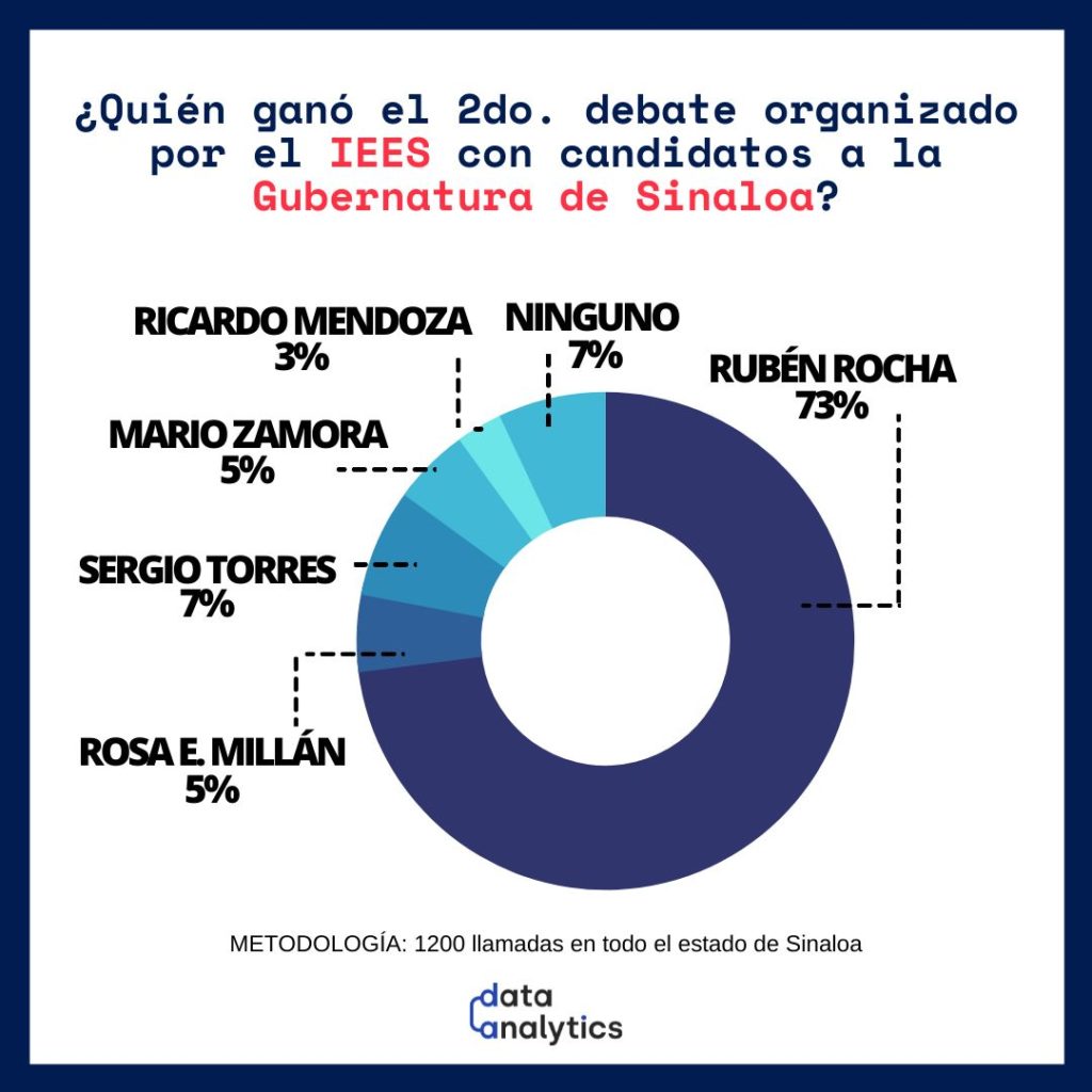 La percepción ciudadana de que Rubén Moya ganó en forma contundente y arrolladora el segundo debate entre candidatos organizado por el Instituto Electoral del Estado de Sinaloa (IEES), es confirmada por la encuesta levantada al término del evento por la empresa Data Analytics, que arroja que el 73 por ciento de los entrevistados vieron ganar […]