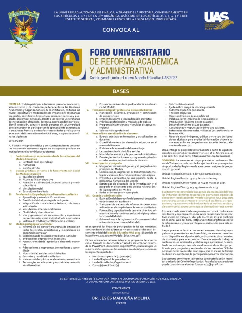 El Rector de la Universidad Autónoma de Sinaloa (UAS), doctor Jesús Madueña Molina, dio a conocer la Convocatoria para el Foro Universitario de Reforma Académica y Administrativa “Construyendo juntos el nuevo Modelo Educativo UAS 2022”, con el propósito de que la comunidad universitaria en general participe aportando experiencias y propuestas para poner en marcha el […]