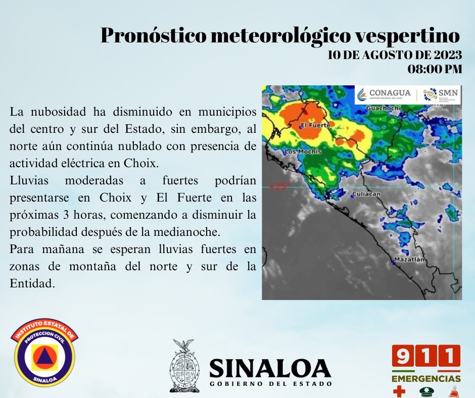 _*El director de Protección Civil Estatal Roy Navarrete, exhortó a las y los ciudadanos a estar atentos a la información oficial en las distintas redes sociales oficiales de la institución._ _*El responsable del servicio meteorológico de Protección Civil Juan Pablo Cerón detalló que los municipios de El Fuerte, Choix y Sinaloa contarán con lluvias fuertes._ […]