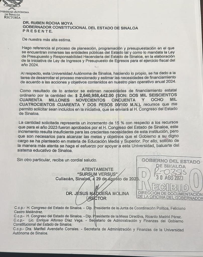 El Presidente de la Junta de Coordinación Política del Congreso del Estado, el diputado Feliciano Castro Meléndrez, dio a conocer durante una entrevista , que en el Congreso se recibió la copia correspondiente, a una solicitud formal que hizo hace unos días el rector de la Universidad Autónoma de Sinaloa, Jesús Madueña Molina al gobernador […]