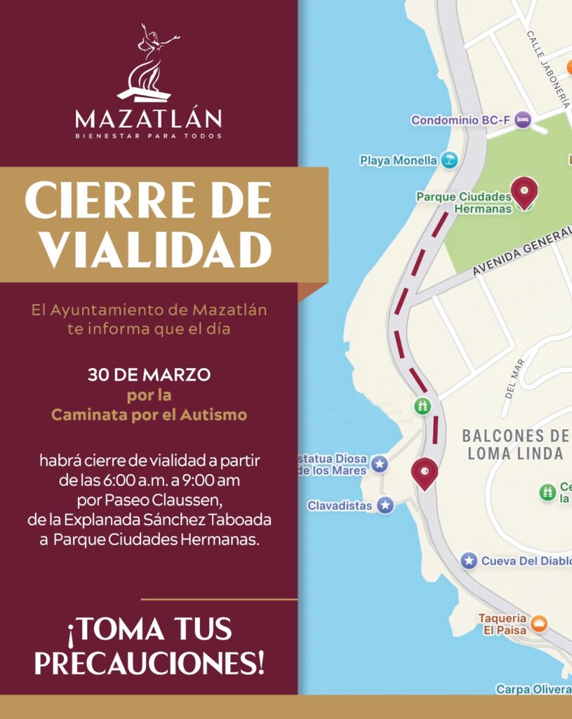 El cierre inicia a las 06:00 horas, de la Glorieta Sánchez Taboada al Parque Ciudades Hermanas_ Mazatlán, Sinaloa.. Con motivo de la Caminata “Paso a Paso por el Autismo”, que organizan el Sistema DIF Sinaloa y el Centro de Rehabilitación e Inclusión Infantil Teletón (CRIT) Sinaloa, en coordinación con diversas organizaciones de niñas y niños […]