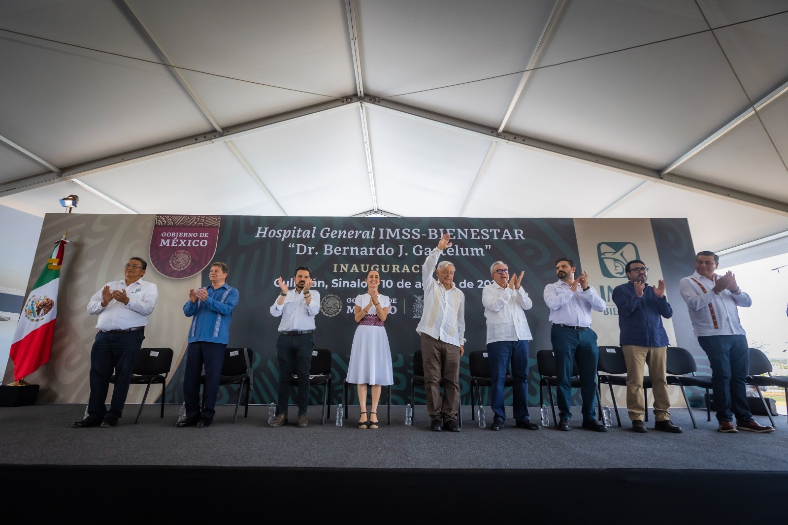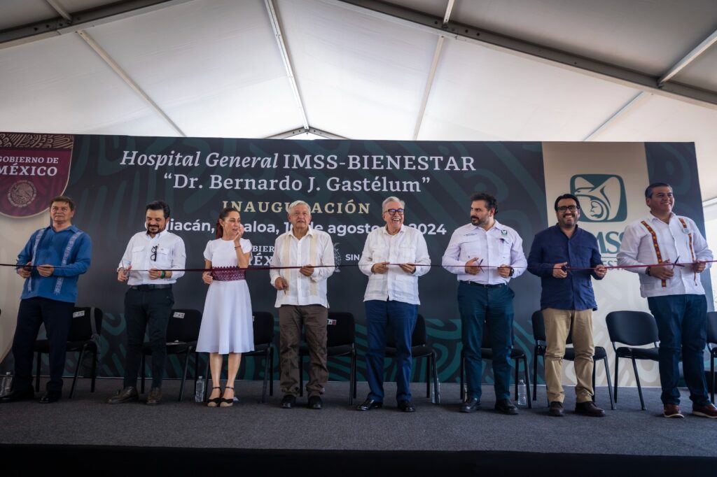 Culiacán, Sinaloa, a 10 de agosto de 2024.- Acompañado por el presidente de la República, Andrés Manuel López Obrador y por la virtual presidenta electa de México, Claudia Sheinbaum Pardo, el gobernador Rubén Rocha Moya inauguró junto con ambos el nuevo Hospital General de Culiacán “Bernardo J. Gastélum”, que operará bajo el nuevo sistema de salud del IMSS Bienestar, con servicios totalmente gratuitos para toda la población no derechohabiente de los sistemas de seguridad social tradicionales como son el IMSS y el ISSSTE.