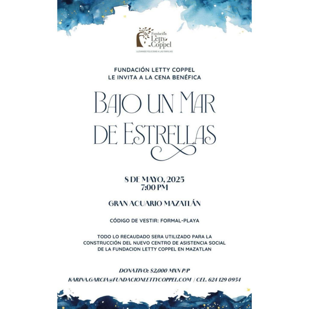 Mazatlán, Sinaloa.- La fundación Letty Coppel anunció la cena show “Bajo un mar de Estrellas”, el próximo 8 de mayo en el gran Acuario Mazatlán, a las 7 de la noche.