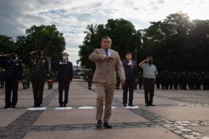 Culiacán, Sinaloa, 30 de julio del 2022.- Autoridades civiles y militares conmemoraron el aniversario luctuoso número 211 del padre de la patria, Miguel Hidalgo y Costilla, con un izamiento de bandera a media asta y con Honores de Ordenanza en la plaza cívica de Palacio de Gobierno.