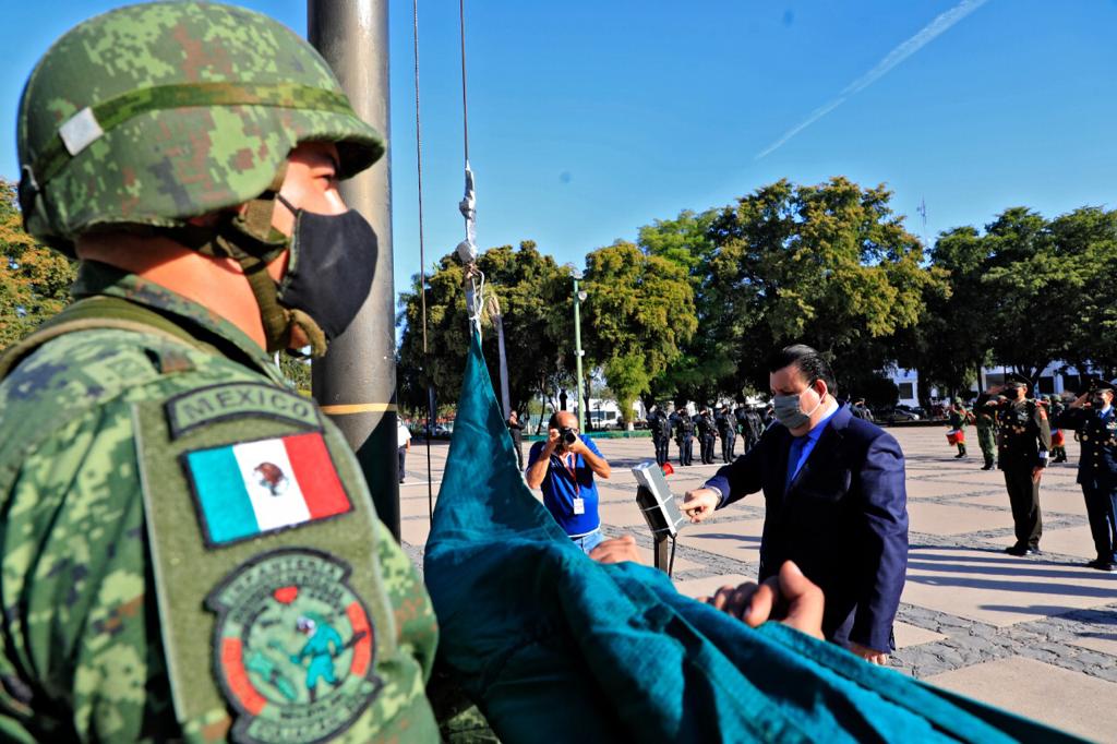 Autoridades civiles y militares conmemoraron el aniversario luctuoso número 96 del General Ángel Flores con un izamiento de bandera a media asta con honores de ordenanza en la plaza cívica de Palacio de Gobierno, acto que fue seguido por la entonación del Himno Nacional Mexicano.