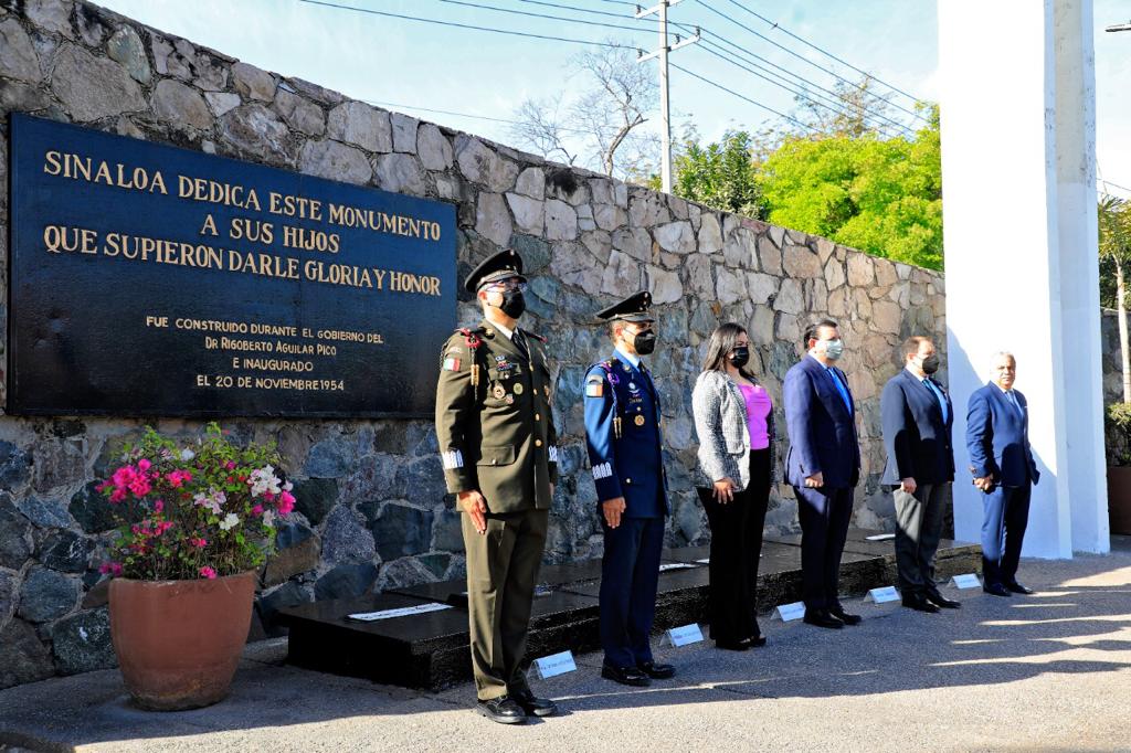 Tras rendir los honores a la bandera, las autoridades presentes se desplazaron a la Rotonda de los Sinaloenses Ilustres, ubicada sobre el Boulevard Leyva Solano, frente al Panteón Civil, donde se realizó una guardia de honor con un minuto de silencio.