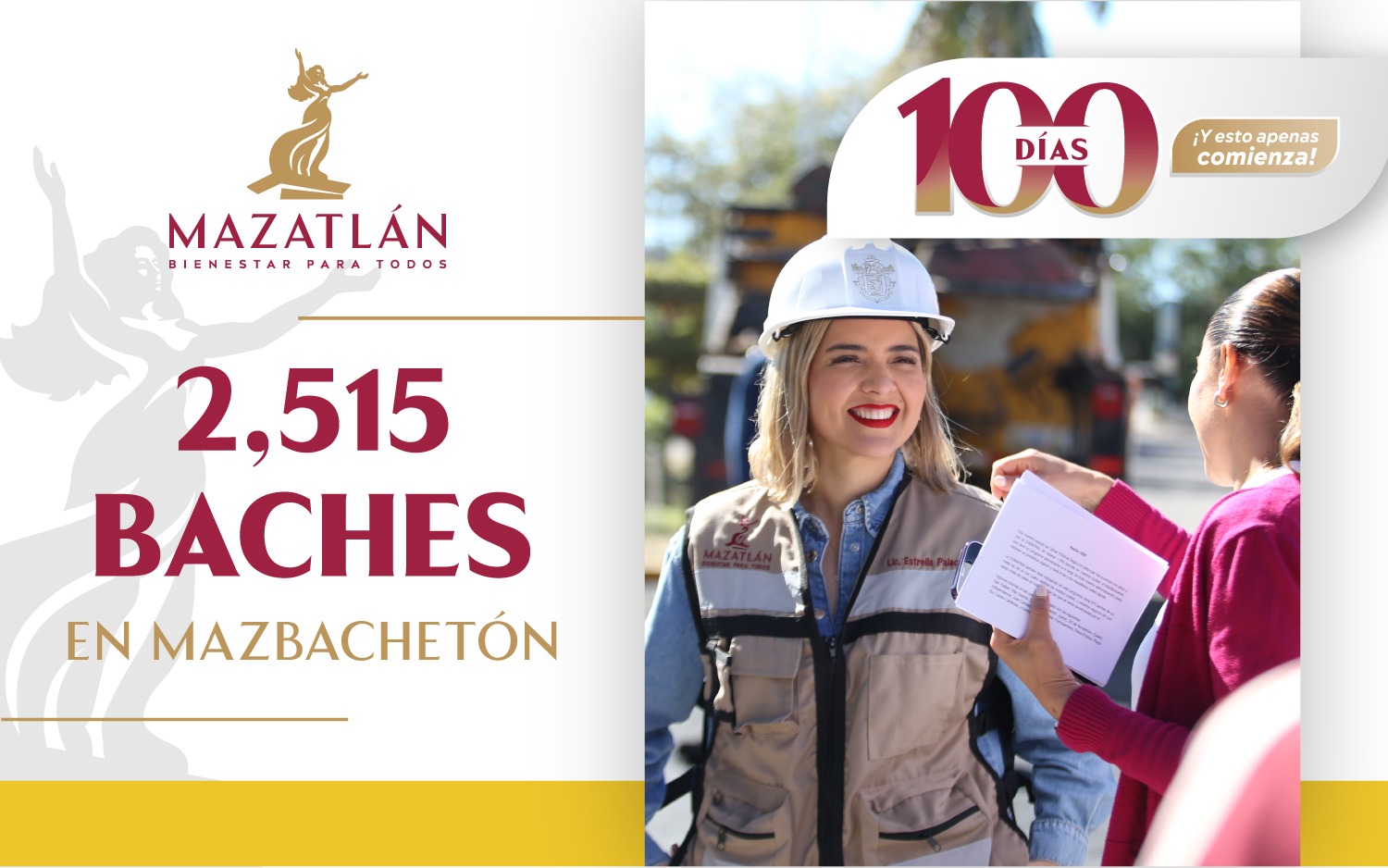 En los Primeros 100 Días de Gobierno, se superan las metas y se logra dar mantenimiento a 190 kilómetros de los caminos que alimentan a Mazatlán; se reparan 2,515 baches en todo el puerto; se pavimentan 8 calles y se da inicio a otras 9; se reparan 1,800 luminarias; se remodelan 10 nuevos parques infantiles y se rehabilitan más de 500 áreas verdes