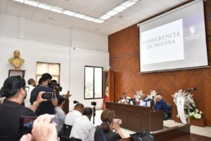 Durante la rueda de prensa, también estuvieron presentes el Secretario del Ayuntamiento Edgar Augusto González Zatarain y el Tesorero Municipal, Javier Alarcón Lizárraga.