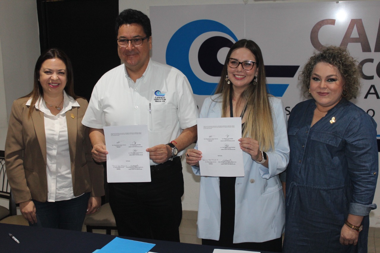 Sus firmas plasmaron en este convenio por el Presidente de Canaco Servytur Sinaloa Sur, Roberto Lem González, y Reyna Esquer, de Coedusi Soluciones.