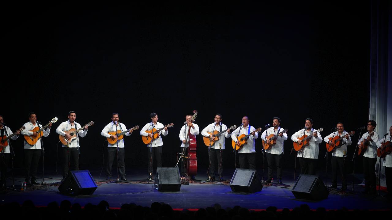 Sobre el escenario del Teatro Ángela Peralta que tuvo una alta asistencia, con un público en su mayoría compuesto por extranjeros, la multipremiada Rondalla integrada por maestros de educación artística de la Secretaría de Educación Pública y Cultura, hicieron sonar sus guitarras para deleitar con piezas populares.