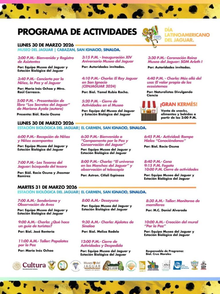 La serie de eventos inician el lunes 30 de marzo, en los que resalta la actuación de la cantante María Inés Ochoa, con un concierto por la paz y la conservación del jaguar; además, la maestra Georgina Martínez estará contando cuentos y y la coronación de la Reina Infantil del Museo del Jaguar.