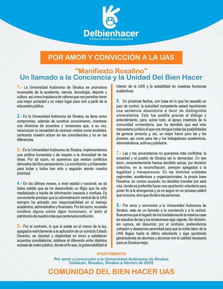 Mazatlán, Sinaloa.- El Comité del “Delbienhacer, Comunidad Participativa”, durante una conferencia de prensa se dió a conocer un “Manifiesto Rosalino”, denominado “Por Amor y Convicción a la Universidad Autónoma de Sinaloa”, como un llamado a la conciencia y unidad en apoyo a la institución educativa.
