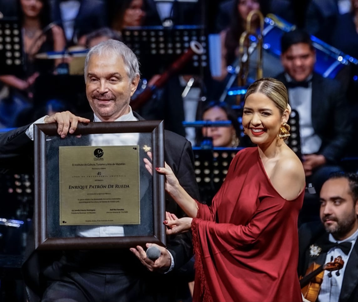 Sobre el escenario, la alcaldesa destacó que Mazatlán celebra toda una vida dedicada a la música y pidió al maestro Enrique Patrón De Rueda, seguir demostrando con su ejemplo, que la música es magia, es poesía, es la vida y es la salvación.