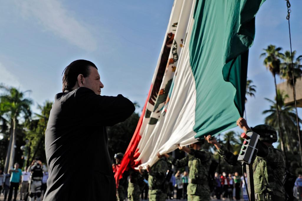 En representación del gobernador Rubén Rocha Moya, el secretario de Obras Públicas José Luis Zavala Cabanillas encabezó este acto conmemorativo, acompañado del diputado Gene René Bojórquez Ruiz, presidente de la Mesa Directiva del H. Congreso del Estado, el magistrado Jesús Iván Chávez Rangel, presidente del Supremo Tribunal de Justicia, el secretario de Obras y Servicios Públicos Municipales Roberto Alfonso Zazueta Tapia y el comandante del 9/o Batallón de la Guardia Nacional Omar Alberto Cabello Zarazúa.