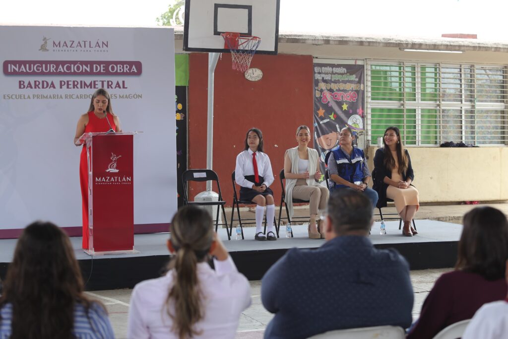 Mazatlán, Sinaloa.- Con el compromiso de brindar una educación pública, gratuita, laica y humanista para las niñas, los niños y los jóvenes, la Presidenta Municipal, Estrella Palacios Domínguez, llevó a cabo la inauguración de la barda perimetral en la Escuela Primaria Ricardo Flores Magón, ubicada en la colonia Urías.
