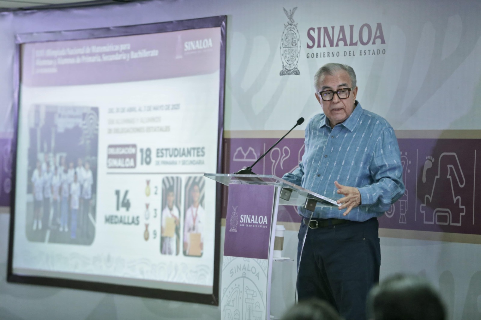 Culiacán, Sinaloa, a 05 de mayo de 2025.- Con excelentes resultados, un total de 18 jóvenes alumnos sinaloenses de educación básica participaron en la fase nacional de la XXV Olimpiada Nacional de Matemáticas para Alumnos de Primaria y Secundaria (ONMAPS), celebrada en esta ocasión en Cholula, Puebla, donde 14 alumnos obtuvieron medallas, destacó este lunes el Gobernador Rubén Rocha Moya, durante su Conferencia Semanera.