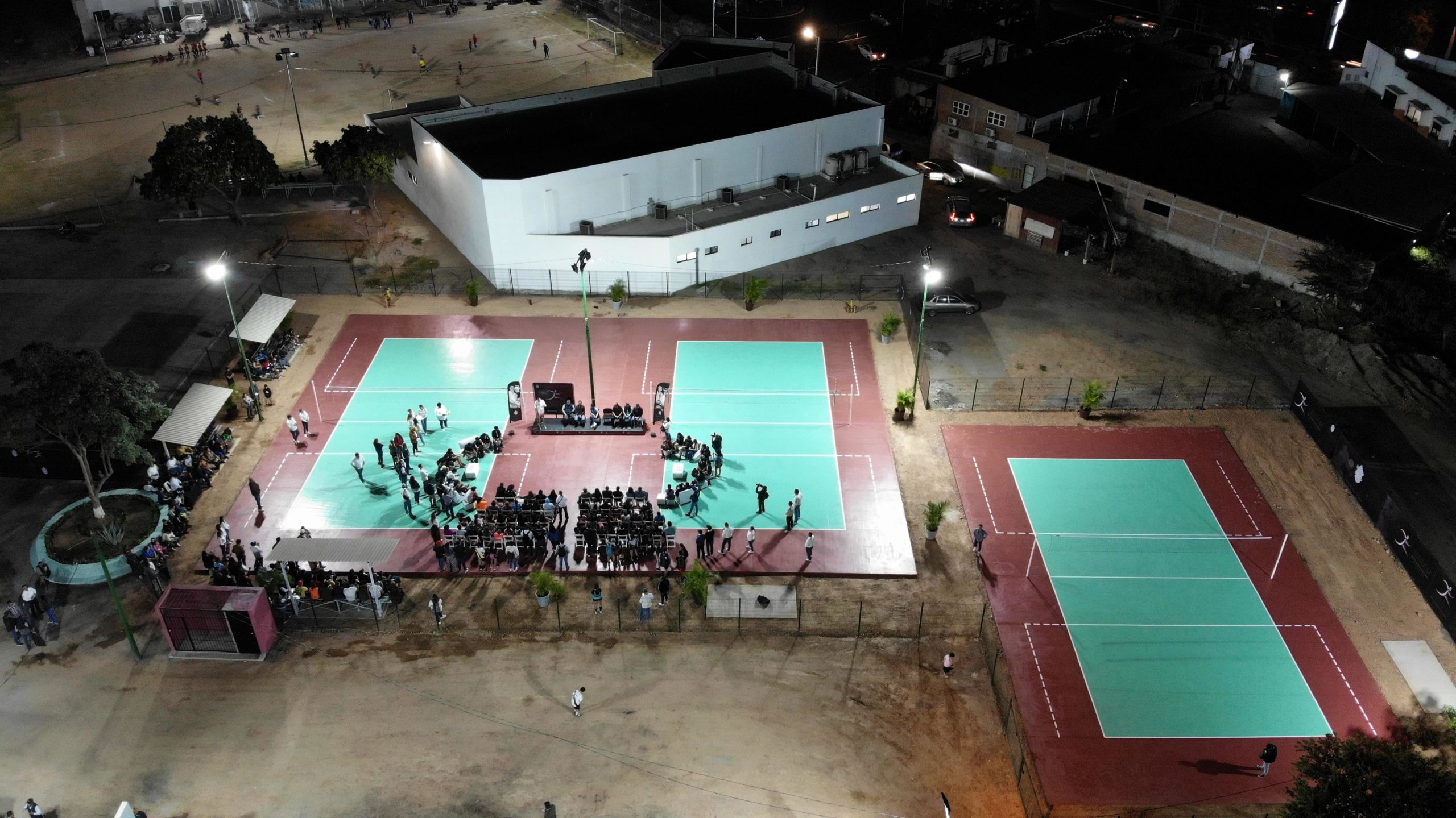 Con una inversión superior a 1 millón 910 mil pesos, el rescate del espacio contó con la limpieza, reacondicionamiento y colocación de gradas, tirado de sobreplancha de concreto, colocación de filtro y nueva arena, área de regaderas, cercado, perimetral, iluminación, así como pintura en general en las cinco canchas.