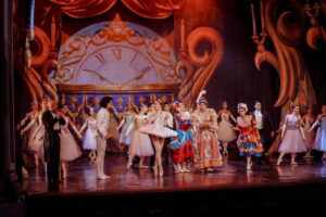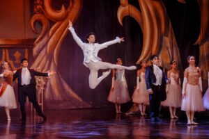 Uno de los momentos sorprendentes de la noche fue la aparición del carruaje dorado de Cenicienta, una imponente pieza escénica que emergió entre luces suaves y destellos de ensueño. A bordo de él, la protagonista llegó al palacio para protagonizar junto al Príncipe un baile lleno de elegancia y romanticismo. Ambos ejecutaron un pas de deux de exquisita precisión, con movimientos que parecían flotar al compás de la orquesta, logrando uno de los momentos más conmovedores del espectáculo.