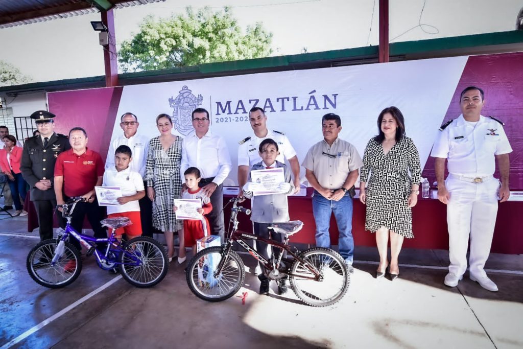 Para finalizar el evento el Alcalde Edgar González y la Presidenta del Sistema DIF, María Teresa Apodaca de González entregaron reconocimiento a estudiantes destacados, además de una bandera con su asta, material deportivo, bolsas de dulces, tres bicicletas y juguetes.