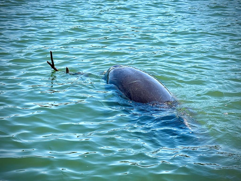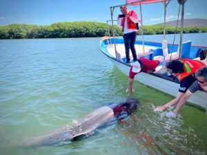 El Pechocho es un Delfín de 33 años de vida que juega, se regodea y se entrega con desmesura al placer que le provocan las caricias de quienes lo visitan en la Ensenada del Bichi de la Bahía de Topolobampo.