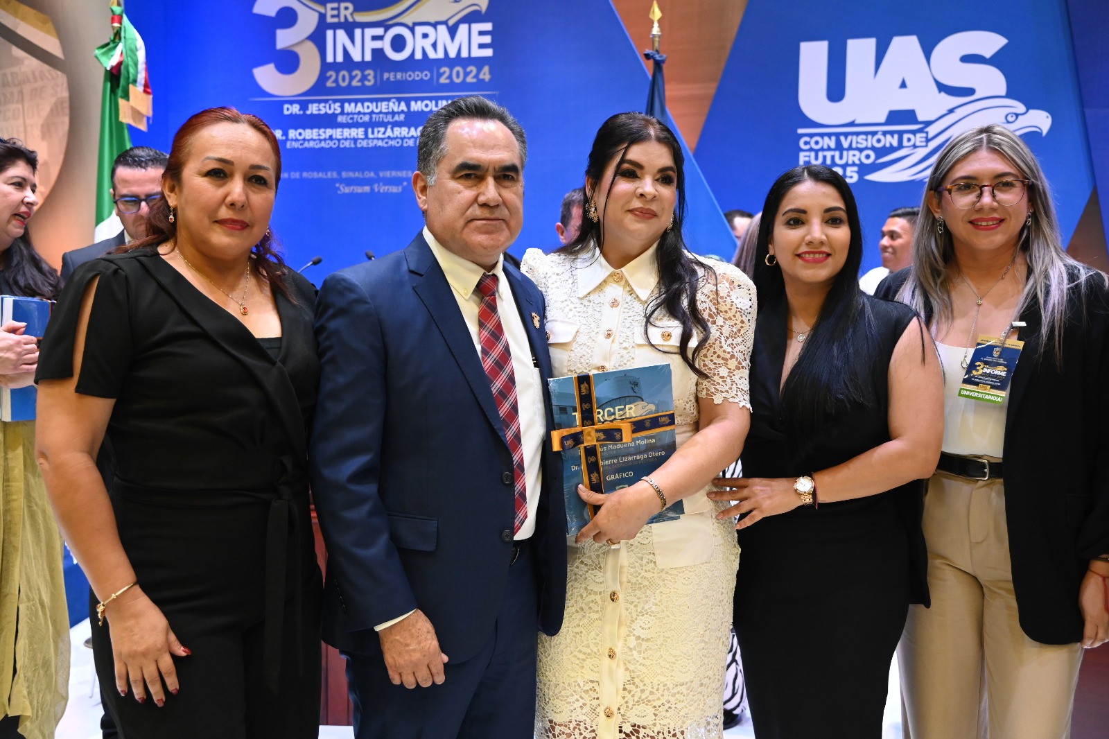 La dirigente del Sindicato Único de Trabajadores de la Universidad Autónoma de Sinaloa (SUNTUAS) sección Administrativos y de Intendencia, maestra Marisela Guadalupe Pérez Carrillo, asistió al tercer informe de labores 2023-2024 del Rector Titular Jesús Madueña Molina, y respaldó los avances obtenidos a lo largo de su gestión.