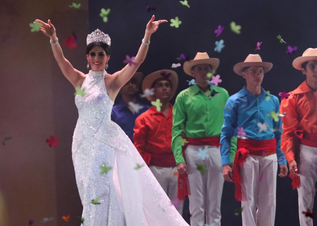 Ataviada en un vestido blanco diseñado por Andrés Romo y confeccionado por Sodelva Ríos, la joven recibió su corona y báculo real, de manos de Sandra Lorenzano, ganadora del Premio Clemencia Isaura de Poesía 2023.