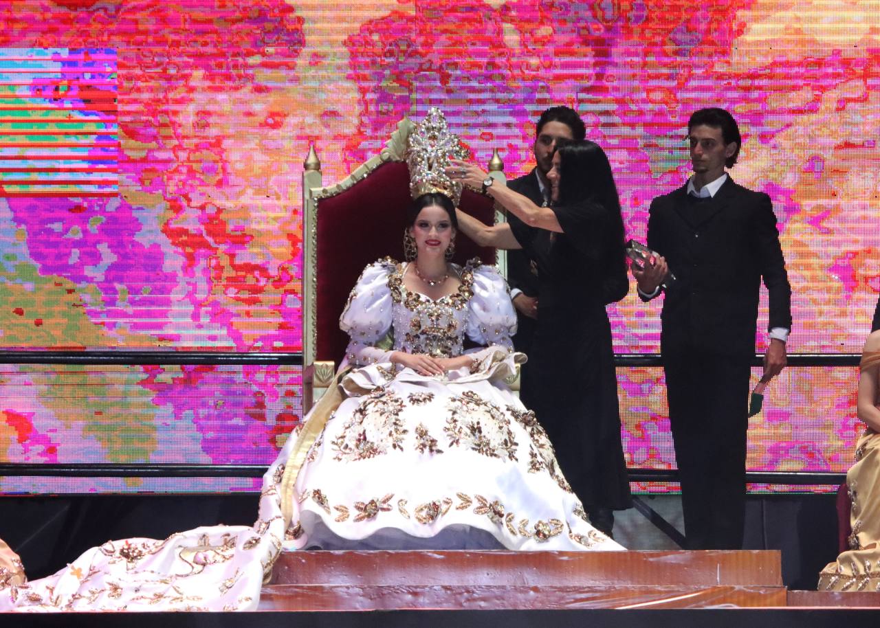 Ataviada en un vestido blanco diseñado por Andrés Romo y confeccionado por Sodelva Ríos, la joven recibió su corona y báculo real, de manos de Sandra Lorenzano, ganadora del Premio Clemencia Isaura de Poesía 2023.