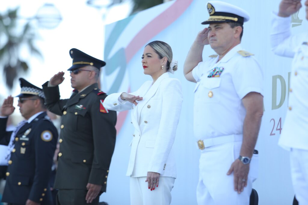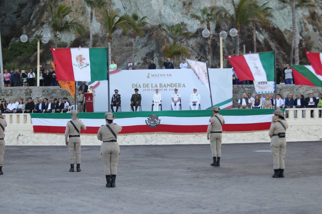 La Presidenta de Mazatlán, Estrella Palacios Domínguez, llevó a cabo el abanderamiento a cinco escuelas, acompañada por representantes de instituciones de seguridad, para posteriormente, alumnos del Colegio Militarizado realizaron una reseña sobre las diferentes banderas del país que se han creado hasta la actualidad.