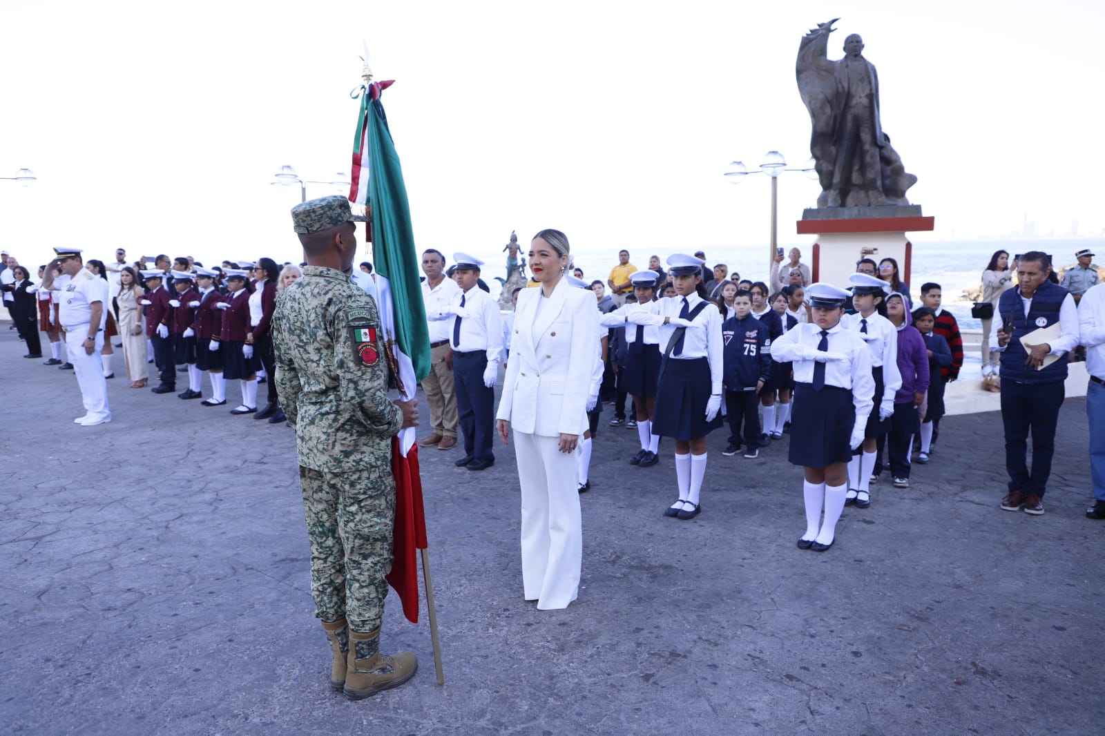Autoridades municipales, militares, navales y educativas llevan a cabo una ceremonia cívica para honrar al lábaro patrio