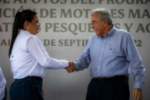 *Navolato, Sinaloa, a 12 de Septiembre de 2022.-* En sintonía con la política pública estatal de apoyo al sector pesquero y con el ánimo de ayudar a quienes desempeñan esta importante labor, el Gobernador Rubén Rocha Moya, acompañado de Flor Emilia Guerra Mena, Secretaria de Pesca y Acuacultura, Margoth Urrea Pérez, Alcaldesa de Navolato, Feliciano Castro Meléndrez, Presidente de Jucopo, entre otras autoridades, encabezó la entrega de apoyos del programa para la adquisición de motores marinos de embarcaciones a cooperativas pesqueras y acuícolas de Sinaloa, en las inmediaciones del campo pesquero El Castillo.
