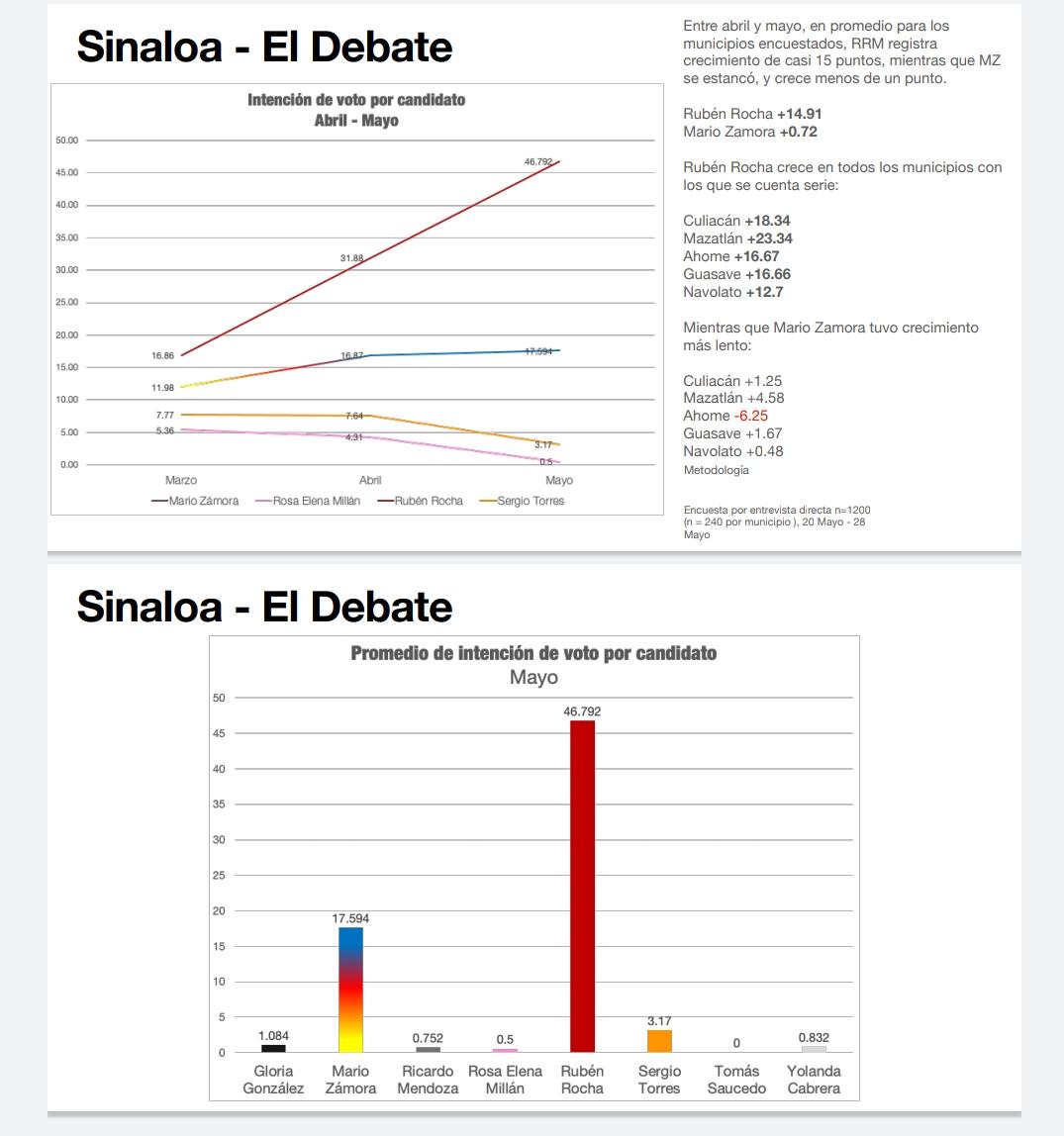 El Debate aplicó mil 200 cuestionarios efectivos a ciudadanos mayores de 18 años de forma directa en 120 secciones electorales seleccionadas por sorteo, distribuidas en los municipios de Ahome, Culiacán, Guasave, Mazatlán y Navolato, siguiendo la proporción urbana rural para un total de 240 entrevistas por municipio, donde Rubén Rocha Moya tiene una clara ventaja con 46 puntos contra Mario Zamora quien está en segundo lugar con apenas 17 puntos.