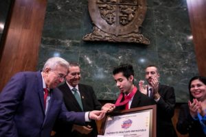 El mandatario estatal, junto con el presidente del Supremo Tribunal de Justicia, magistrado Jesús Iván Chávez Rangel, fue invitado por los diputados de la 64 Legislatura del Congreso del Estado, para la ceremonia de entrega de dicho galardón, que en esta ocasión recibieron los jóvenes Humberto Machado Hernández, en el ámbito académico, científico y tecnológico; Juan Carlos Gabriel Carlón Moreno, ámbito cívico social; Pauleth Mejía Hernández, en el ámbito deportivo (y en su caso en la rama de deportistas con capacidades diferentes); y Mariana Chaidez García, galardonada en el mérito artístico.