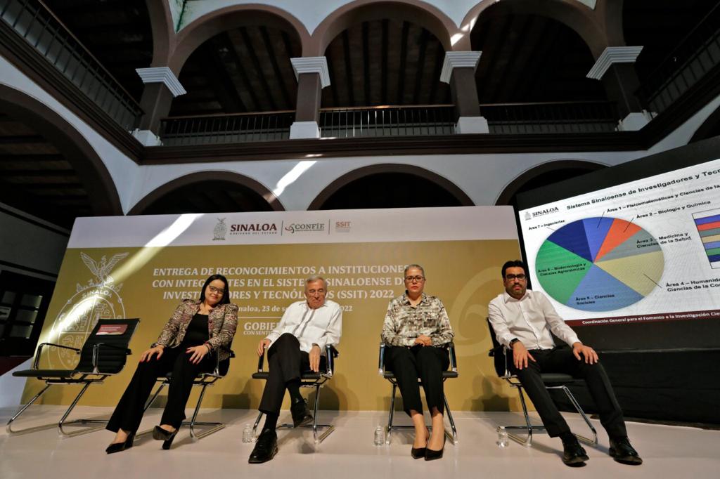 Culiacán, Sinaloa, a 23 de septiembre de 2022.- En sintonía con la política estatal de impulso a la ciencia, tecnología y generación de conocimientos, el Gobernador Rubén Rocha Moya, en conjunto con la Coordinación General para el Fomento a la Investigación Científica e Innovación del Estado de Sinaloa (Confie) que dirige Carlos Karam Quiñónez, encabezó la ceremonia de entrega de reconocimientos a instituciones con integrantes en el Sistema Sinaloense de Investigadores y Tecnólogos (SSIT) 2022.