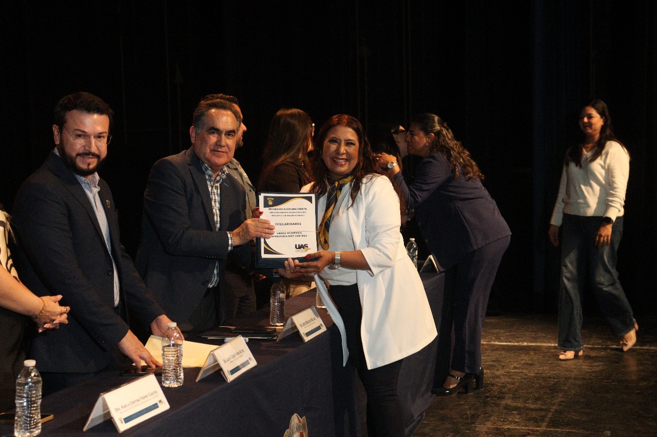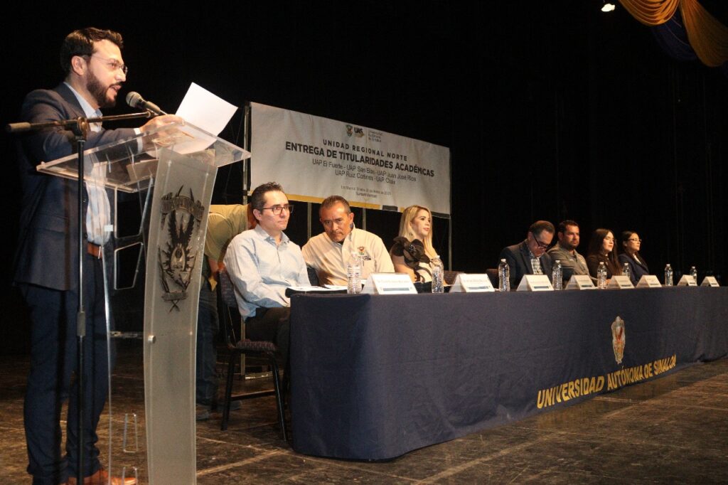 En el Teatro Universitario Mochis y ante la presencia del Vicerrector de la URN, doctor Lauro César Parra Aceviz, se entregaron titularidades a docentes de las preparatorias El Fuerte, San Blas, Juan José Ríos, Ruíz Cortínez y Choix.