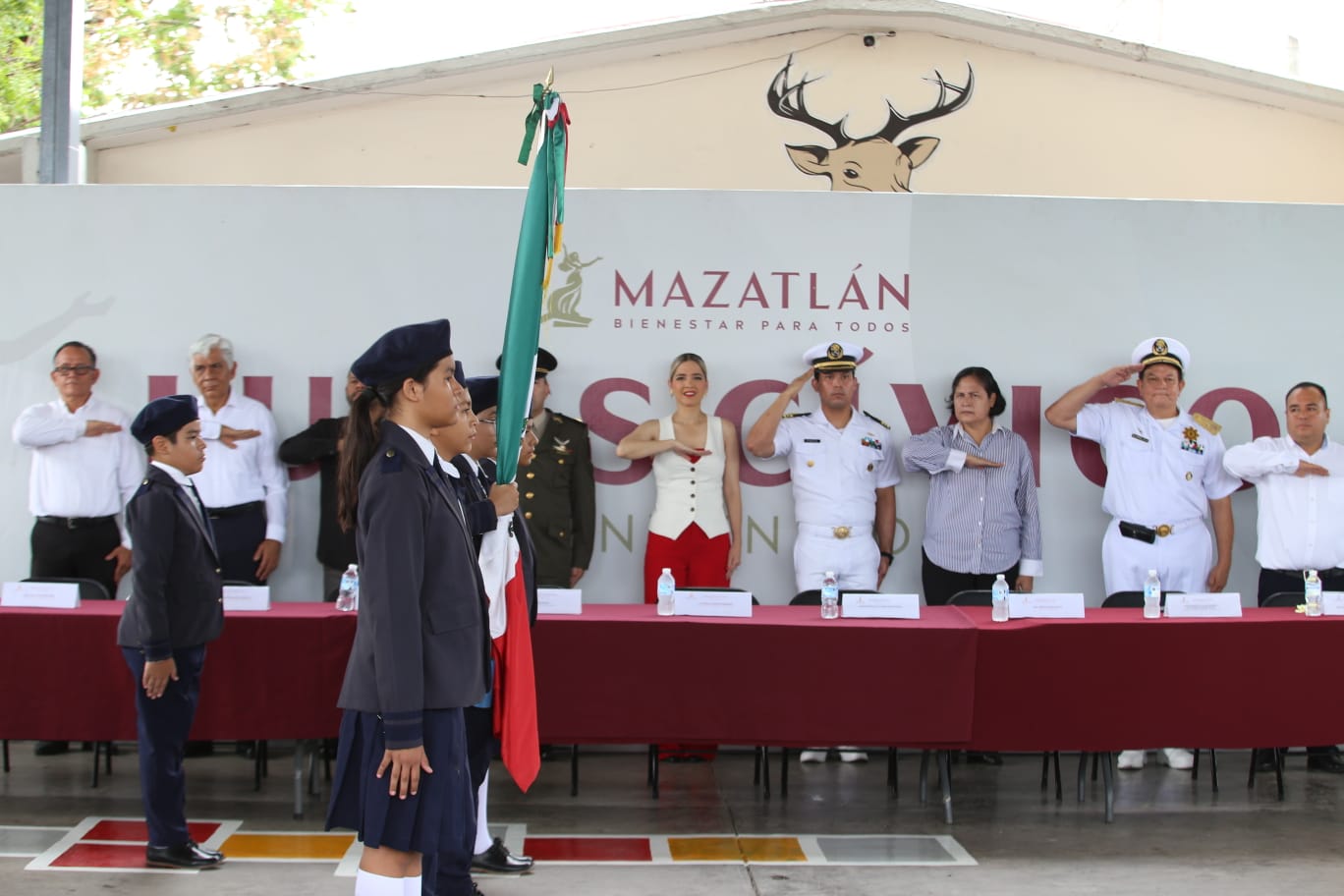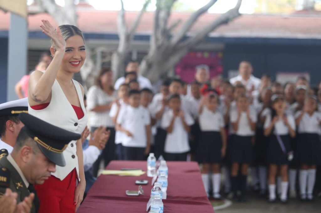 Durante la ceremonia, los asistentes realizaron honores a la enseña patria, se entonó el Himno Nacional, y la Presidenta Municipal hizo entrega de una Bandera con su asta, material deportivo, reconocimientos por excelencia académica y plantó un árbol, acompañada de los alumnos.