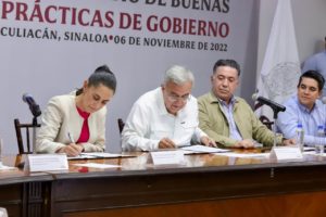 Culiacán, Sinaloa, a 06 de Noviembre de 2022.- Con el objetivo de compartir experiencias y programas de éxito que permitan refrendar a la ciudadanía el compromiso, responsabilidad y voluntad de la administración estatal para generar la transformación de las comunidades sinaloenses, el Gobernador Rubén Rocha Moya firmó esta mañana un convenio de «Intercambio de Buenas Prácticas de Gobierno» con Claudia Sheinbaum Pardo, Jefa de Gobierno de la Ciudad de México.