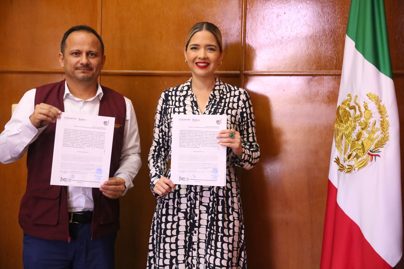 Mazatlán, Sinaloa.- La Presidenta Municipal, Estrella Palacios Domínguez, y el Director de la Procuraduría Federal del Consumidor (PROFECO) en la Zona Pacífico, Israel Alcaraz Hernández, firmaron un convenio de colaboración con el objetivo de coordinar esfuerzos de trabajo y defender los derechos de los consumidores en Mazatlán.