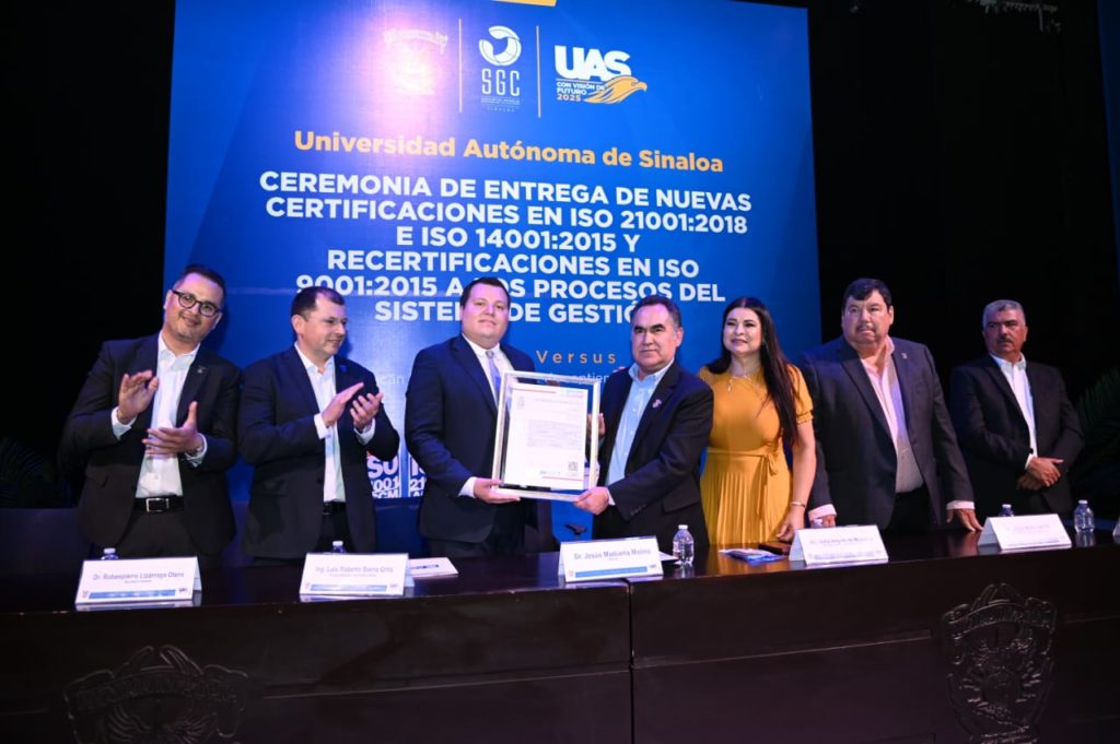 Por la calidad en sus procesos del Sistema de Gestión la Universidad Autónoma de Sinaloa (UAS) recibió más de 363 documentos de nuevas Certificaciones ISO 21001:2018, ISO 14001:2015 y recertificaciones en ISO 9001:2015 otorgadas por el organismo externo ACCM América en evento encabezado por el Rector, doctor Jesús Madueña Molina.