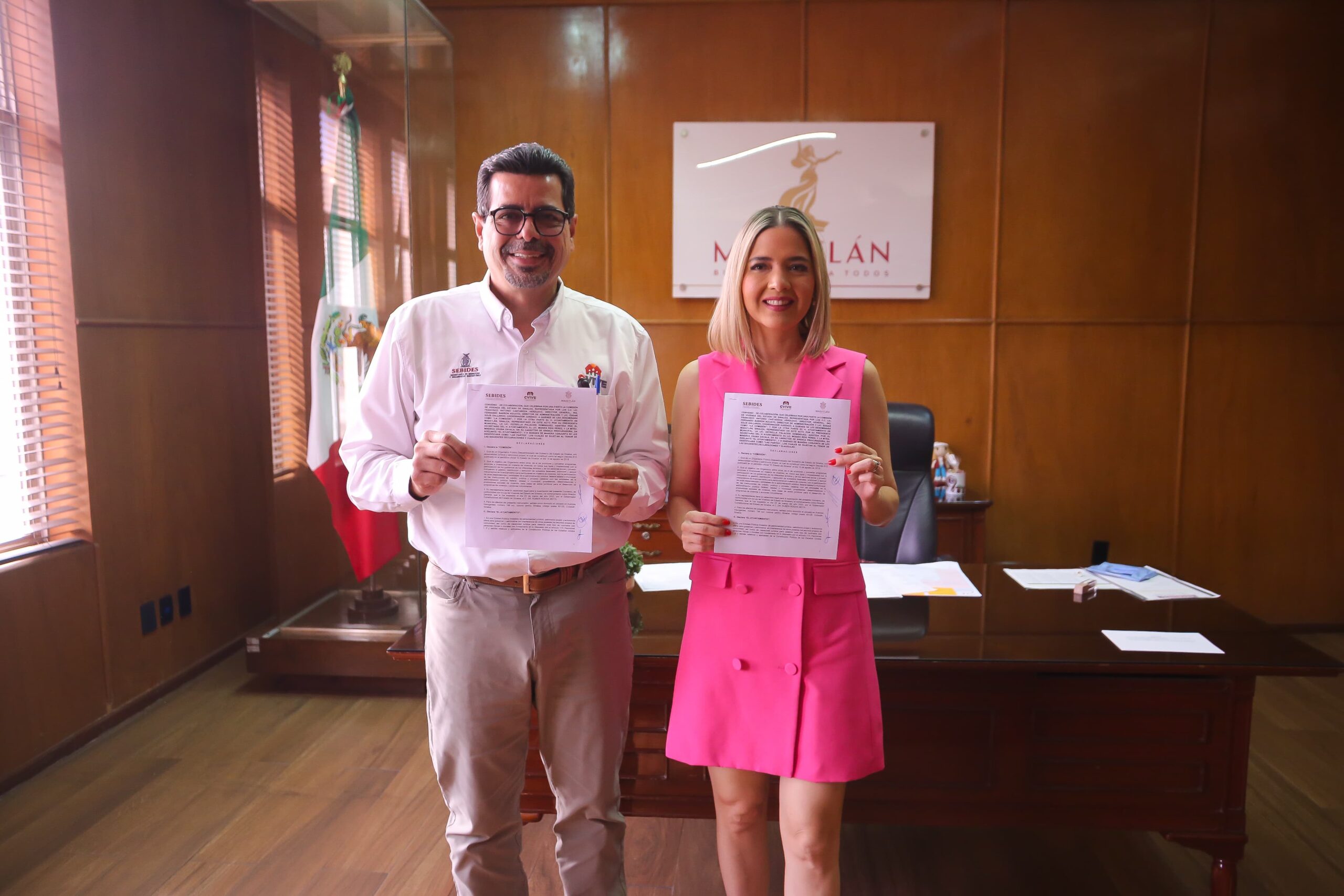 Mazatlán, Sinaloa.- En respuesta a las acciones de gobierno de la Presidenta de México, Claudia Sheinbaum Pardo, y de acuerdo con el trabajo que realiza Gobierno del Estado, la Presidenta Municipal, Estrella Palacios Domínguez, firmó este jueves un convenio de colaboración con el Director de la Comisión de Vivienda del Estado de Sinaloa (CVIVE), Francisco Antonio Castañeda Verduzco.