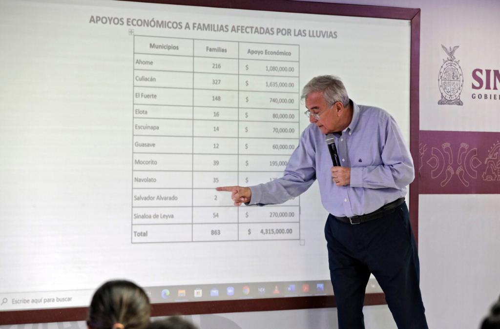 El mandatario estatal agregó que los municipios a los que se les ha proporcionado este apoyo han sido Ahome, con 216 familias y un apoyo económico de 1 millón 80 mil pesos, Culiacán con 327 familias y 1 millón 635 mil pesos, El Fuerte con 148 familias y 740 mil pesos, Elota con 16 familias y 80 mil pesos, Escuinapa con 14 familias y 70 mil pesos, Guasave con 12 familias y 60 mil pesos, Mocorito con 39 familias y 195 mil pesos, Navolato con 35 familias y 175 mil pesos, Salvador Alvarado con 2 familias y 10 mil pesos y Sinaloa municipio con 54 familias y 270 mil pesos.