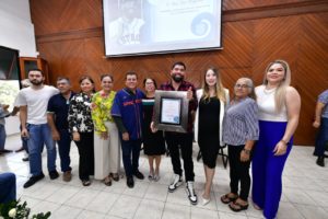 Mazatlán, Sinaloa, 24 de noviembre de 2022.- Apoyar, impulsar y reconocer el talento mazatleco es de suma importancia para el Gobierno de Mazatlán, por ello, la mañana de este jueves, el Alcalde, Edgar González Zatarain, acompañado de su esposa, la Presidenta del Sistema DIF Municipal, María Teresa Apodaca de González, y el Secretario del Ayuntamiento, Rafael Mendoza, entregaron un especial reconocimiento al deportista mazatleco José Luis Urquidy.