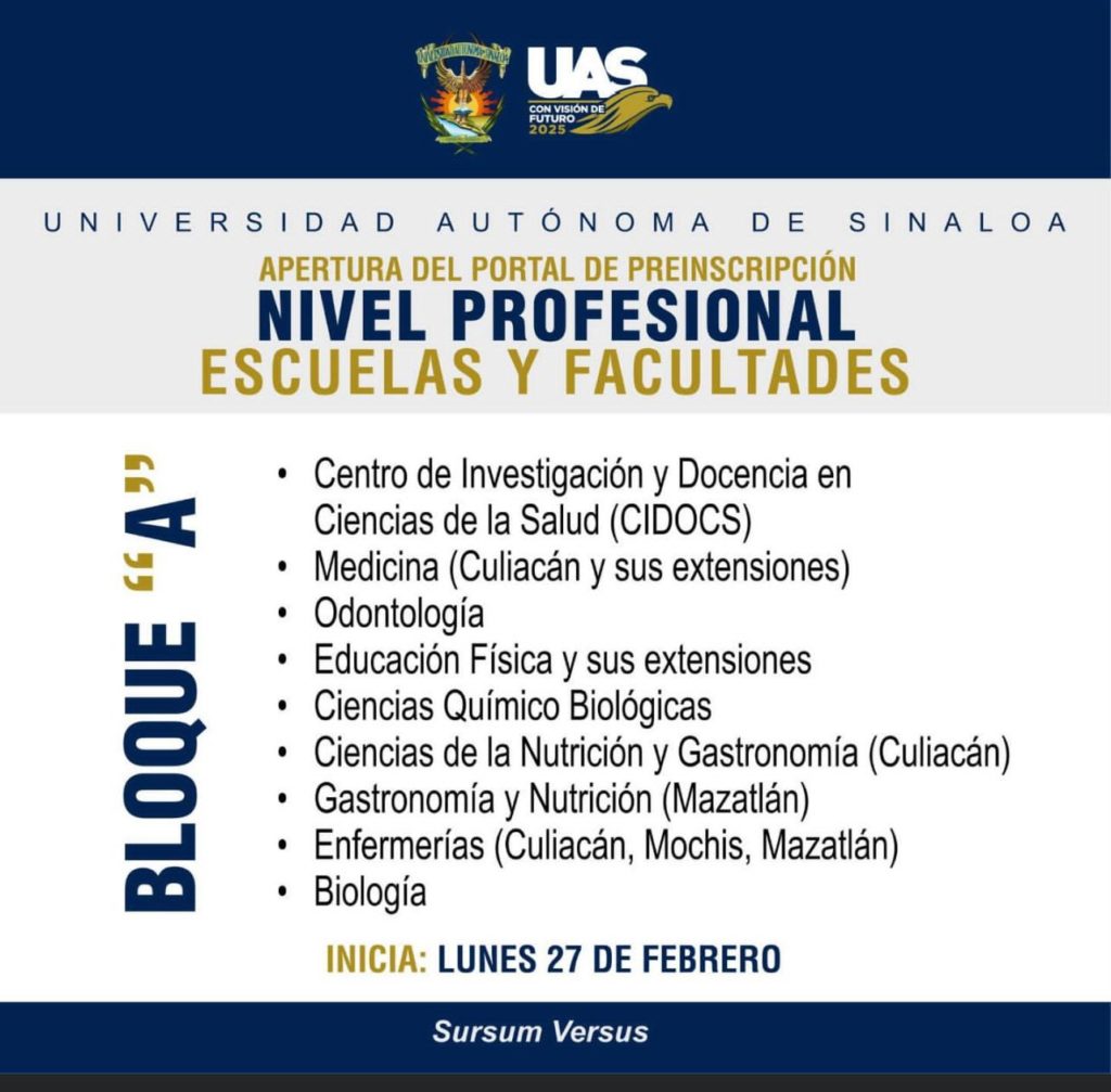 Luego de que la semana pasada se abriera el sistema para la entrega de fichas en la Universidad Autónoma de Sinaloa (UAS) para el Nivel Medio Superior en las cuatro unidades regionales, el Rector, doctor Jesús Madueña Molina, señaló que este lunes 27 se abre el portal para el Nivel Superior iniciando con las carreras del Bloque A del área de la salud.