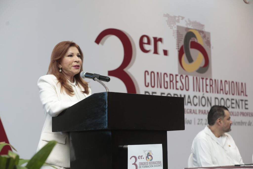 En su mensaje, la secretaria de Educación Pública y Cultura, Gloria Himelda Félix Niebla, destacó que con la realización de este Tercer Congreso Internacional de Formación Docente, Sinaloa y particularmente Mazatlán son el epicentro del diálogo académica de las escuelas normales, en donde se conocerán todas las tendencias y desafíos de la formación docente.