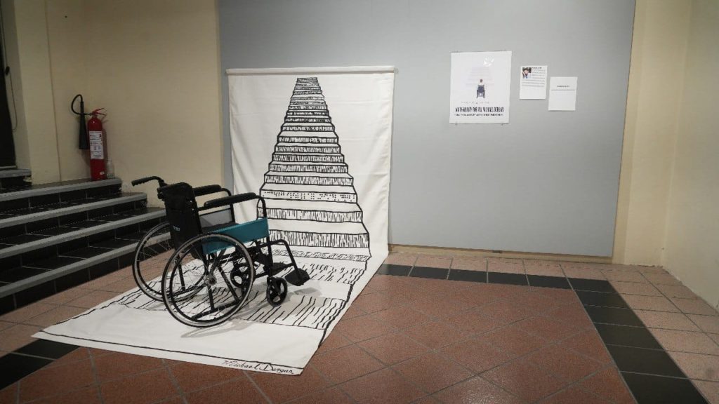 Representa la falta de conciencia e inclusión crónica que existe en nuestra sociedad en loque vivimos. Los obstáculos a diario para una persona con movilidad limitada y en muchos casos sin movilidad son representados por medio de escalones sin fin, representando la discriminación social que debe ser unánime, diversa e inclusiva. Conciencia ausente es una representación real de una sociedad des construida que seguimos viviendo.