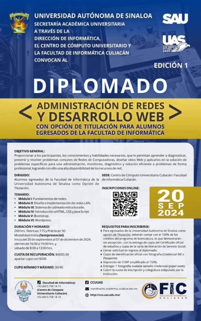 Gracias a los esfuerzos coordinados entre la Secretaría Académica Universitaria, la Dirección de Informática, el Centro de Cómputo Universitario y la Facultad de Informática Culiacán de la Universidad Autónoma de Sinaloa (UAS), fue posible el inicio de la primera edición del Diplomado “Administración de Redes y Desarrollo Web”, el cual tiene la opción de titulación y es orientado a los alumnos egresados de la Unidad Académica de Informática.