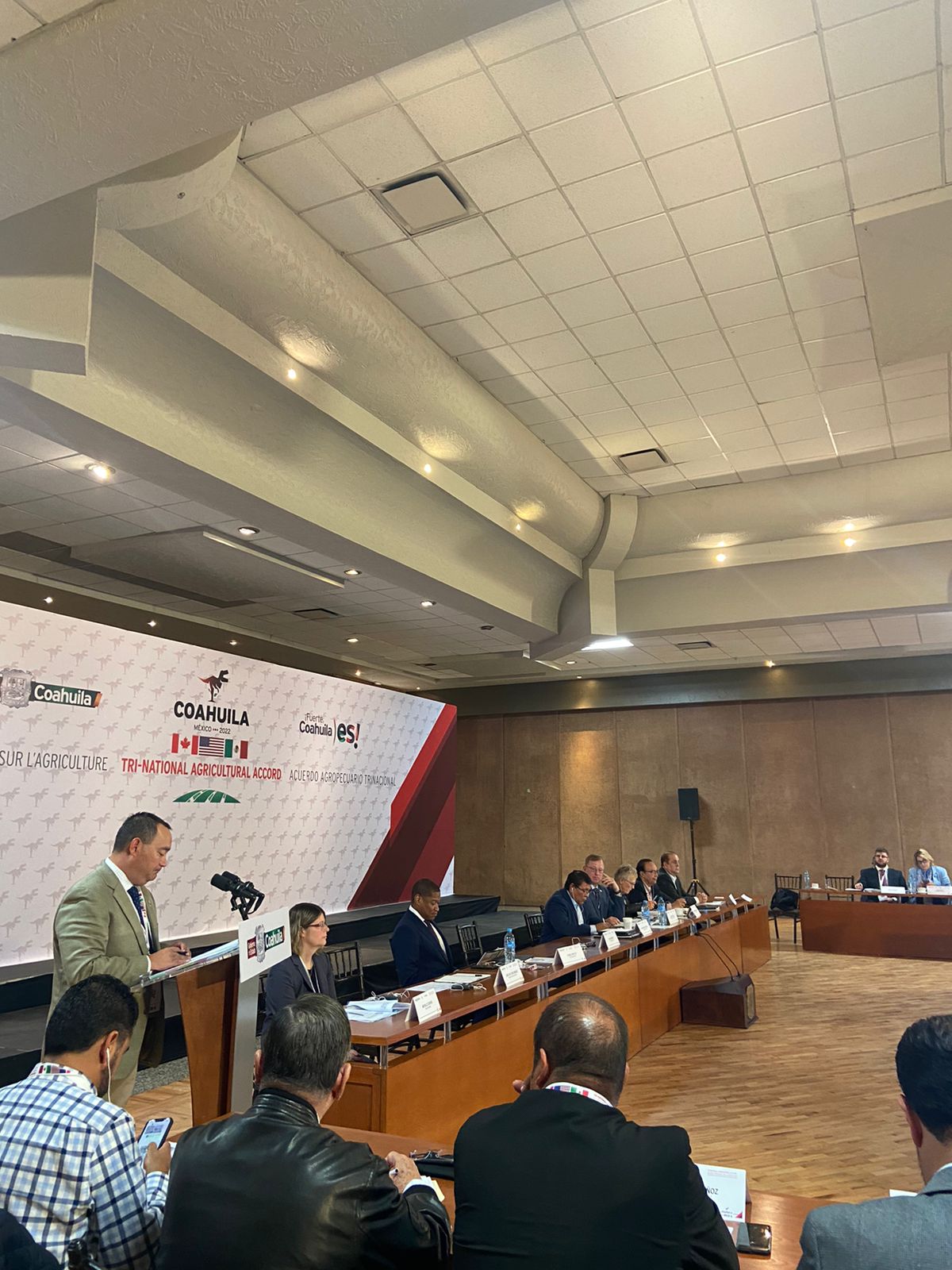Destacó que la región de norteamerica tiene uno de los instrumentos mas poderosos del comercio global como es del Tratado de Libre Comercio México, EEUU y Canadá que como bloque es una de las principales fuentes de proveduría confiable de alimentos para todo el mundo por nuestra situación portuaria y nuestras redes logísticas, las cuales nos permiten llegar a todo el mundo con alimentos sanos, inocuos y accesibles.