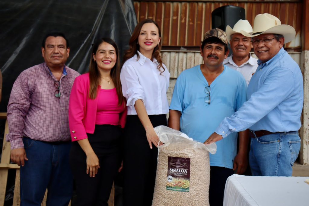 El Secretario de Agricultura y Ganadería de Sinaloa, Ing. José Jaime Montes Salas junto con la Presidenta Municipal de Mocorito, María Elizalde Ruelas hicieron entrega simbólica de los casi 60 mil kilos de semilla de garbanzo que representa el 49.7% del total de la simiente que será distribuida en el estado .