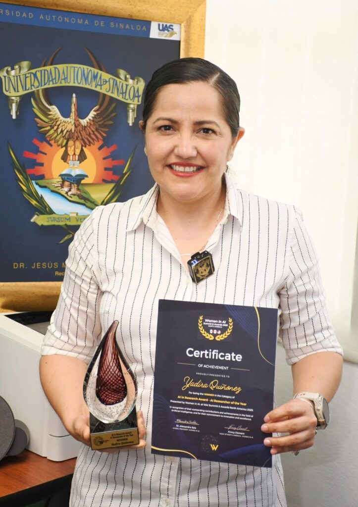 El pasado 7 de junio Quiñonez Carrillo fue galardonada en Toronto Canadá a través de la ceremonia organizada por la Asociación Women in AI Awards 2025, donde participan mujeres de los países de Canadá, Estados Unidos y México; poniendo en alto el nombre de la Universidad Autónoma de Sinaloa.