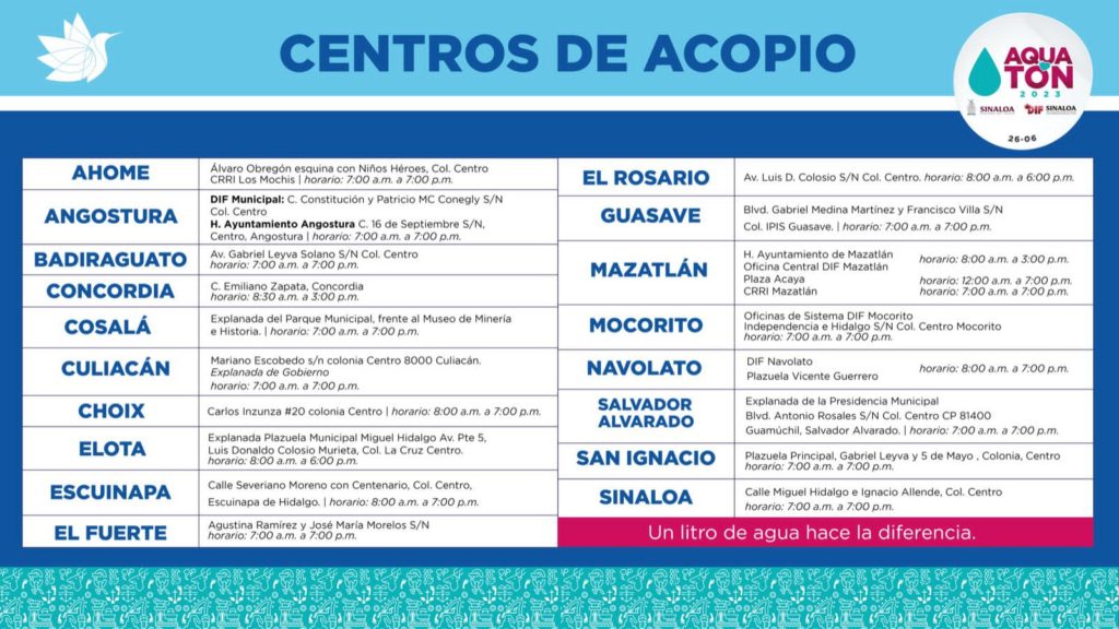 Culiacán, Sinaloa, a 25 de junio del 2023.- Mañana lunes 26 de junio se realizará el segundo AQUATON en Sinaloa, actividad que tiene como objetivo principal recolectar agua para consumo humano la cual será entregada a los ciudadanos de más de 210 comunidades de 15 municipios de Sinaloa que padecen de la falta de agua y las altas temperaturas que se están presentando.